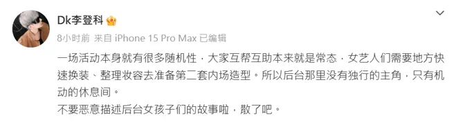 对此,古力娜扎经纪人也在社群发文回应:“一场活动本身就有很多随机性,大家互帮互助本来就是常态。女艺人们需要地方快速换装、整理妆容去准备第二套内场造型,所以后台那里没有独行的主角,只有机动的休息间。”并呼吁外界不要过度渲染或恶意揣测后台女孩子们的故事,喊话:“散了吧。”