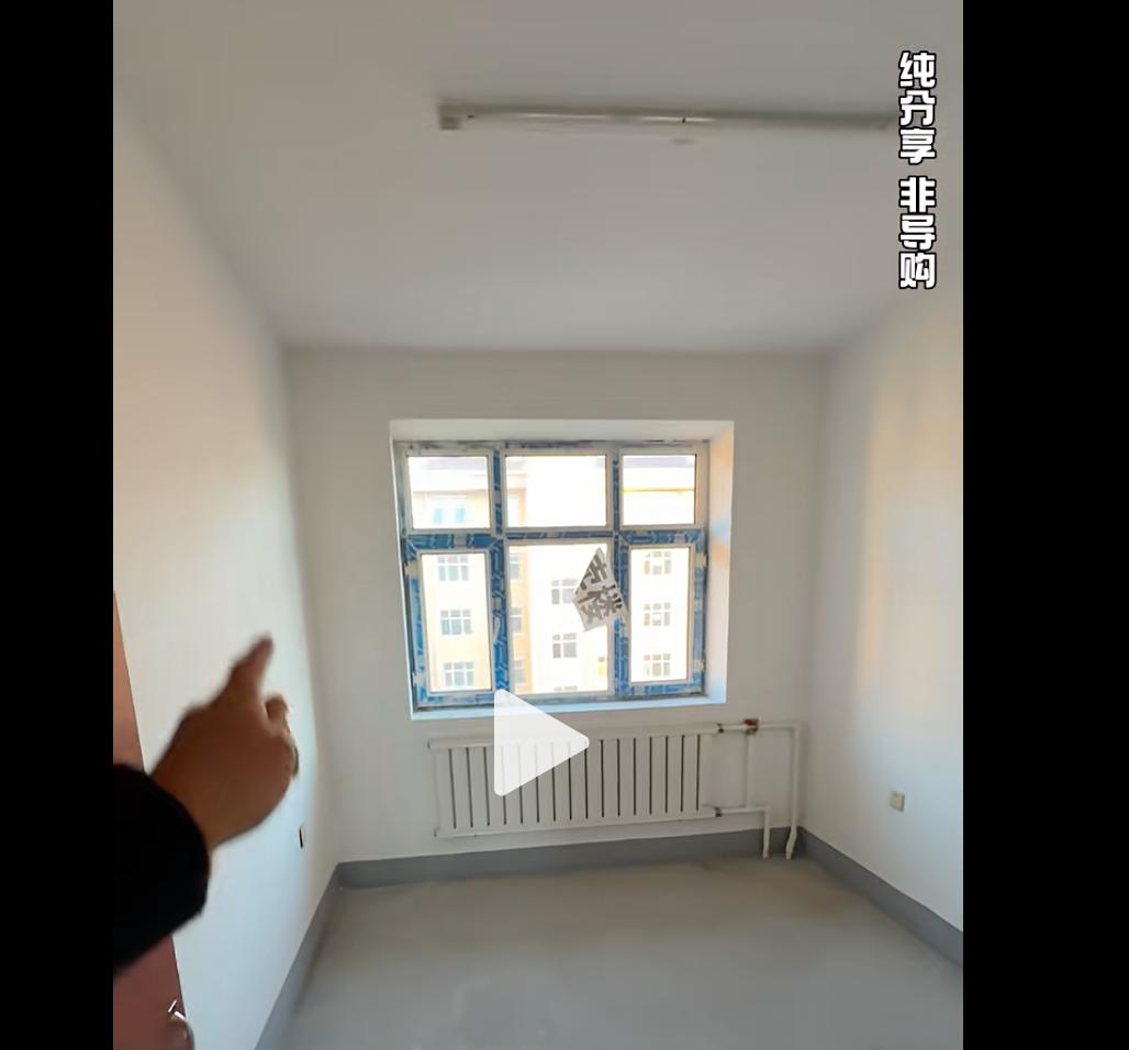 步行上到6楼可以看到,每层为三户,房子内部刷过墙漆,部分贴有瓷砖,暖气、水电、马桶、洗手池等安装齐全,为一室一厅一卫户型,南北通透,客厅的窗户还贴有“卖楼”字样。