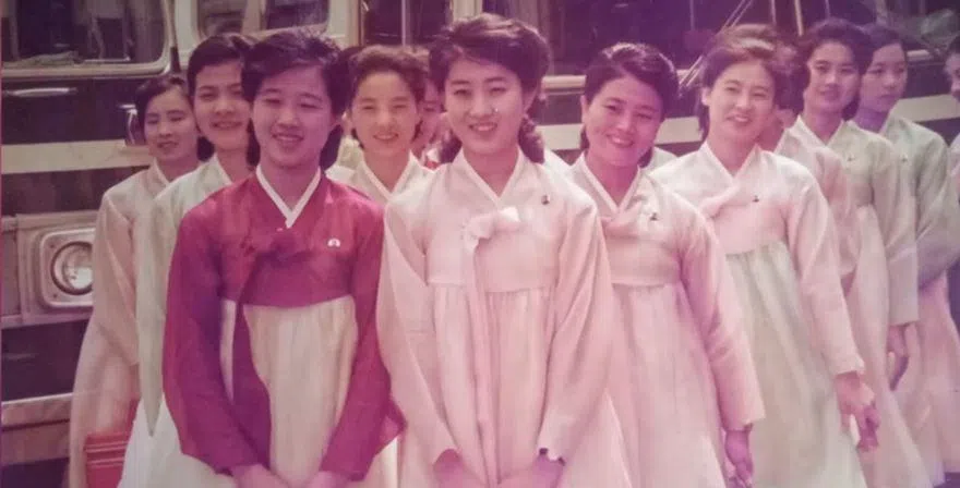 金正恩母亲高容姬(前排右)在万寿台艺术团活动时候的照片。