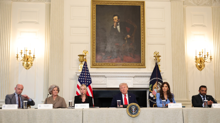 图为2025年10月8日,川普总统(中)在白宫国宴厅的圆桌会议上讨论遏止安提法运动。(Anna Moneymaker/Getty Images)