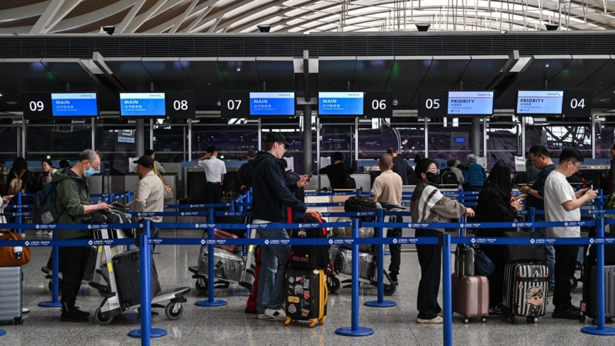 图为资料照。2025年4月17日,乘客在上海浦东国际机场的美国航空公司柜台等候航班。( HECTOR RETAMAL/AFP via Getty Images)
