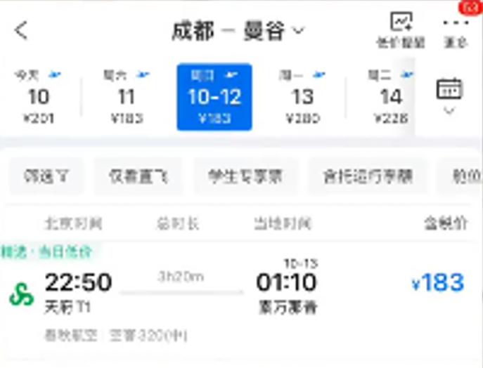 “十一”长假结束后,成都直飞曼谷机票价大跳水,含税价最低仅183元。