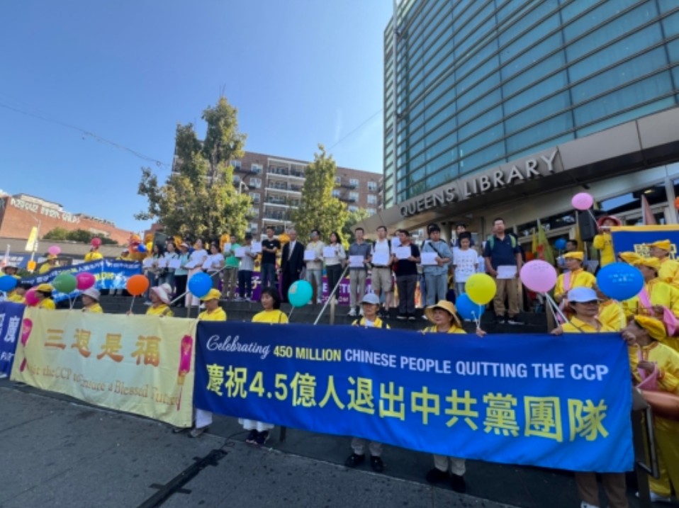 2025年8月10日,在纽约法拉盛唐人街图书馆前,全球.退:党!中心举办活动庆祝4.5亿中国人成功三:退.(退!党!、退*团-、退*队-),有25人在现场公开宣布退!党!,领取退!党!证书。