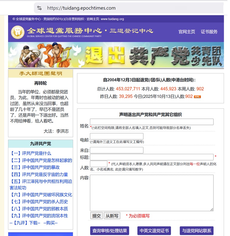 全球.退:党!网站显示,截至2025年10月12日,总计宣布三:退.的人数为4亿5千3百多万人,本月人数为44万5千多人。
