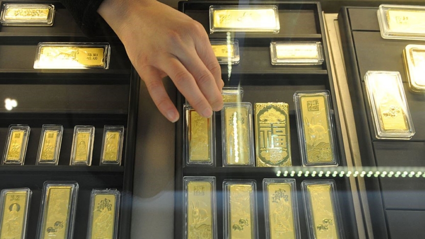 中国东部安徽省合肥市一家金饰店的店员正在整理柜台上展示的金条。资料图与新闻无关。(STR/AFP via Getty Images)