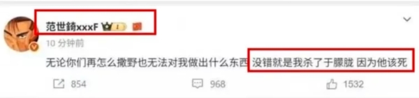 近日,有网友发现,疑似范世锜在微博账号发文:“无论你们再怎么撒野也无法对我做出什么东西,没错就是我杀了于朦胧,因为他该死。”