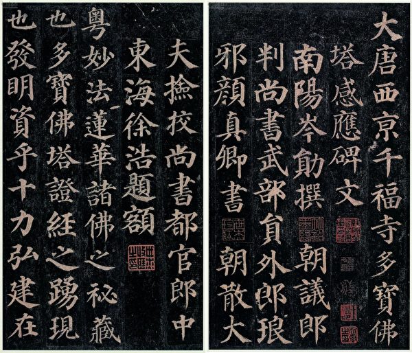 多宝塔碑是颜真卿44岁时所书,是为颜真卿早期楷书代表作品,也是颜体书法的代表帖之一。(公有领域)