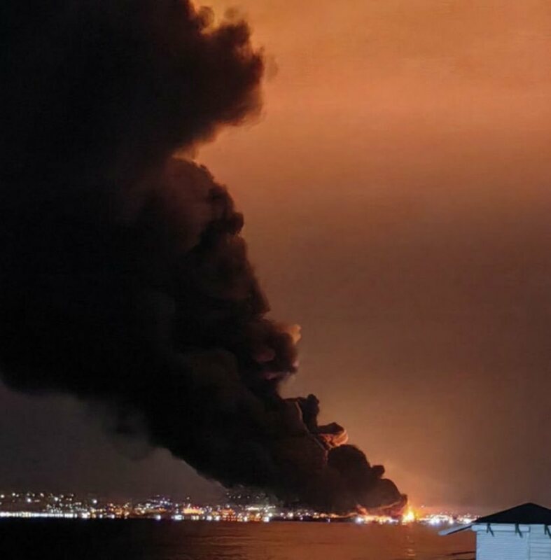 克里米亚费奥多西亚(Feodosia)港遭乌克兰无人机袭击的油库火势仍未扑灭。图:翻摄自 X