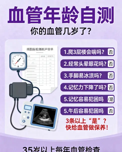 建议35岁以上人群每年做一次血管健康检查,包括血压、血脂、血糖检测,必要时可以做颈动脉超声检查。
