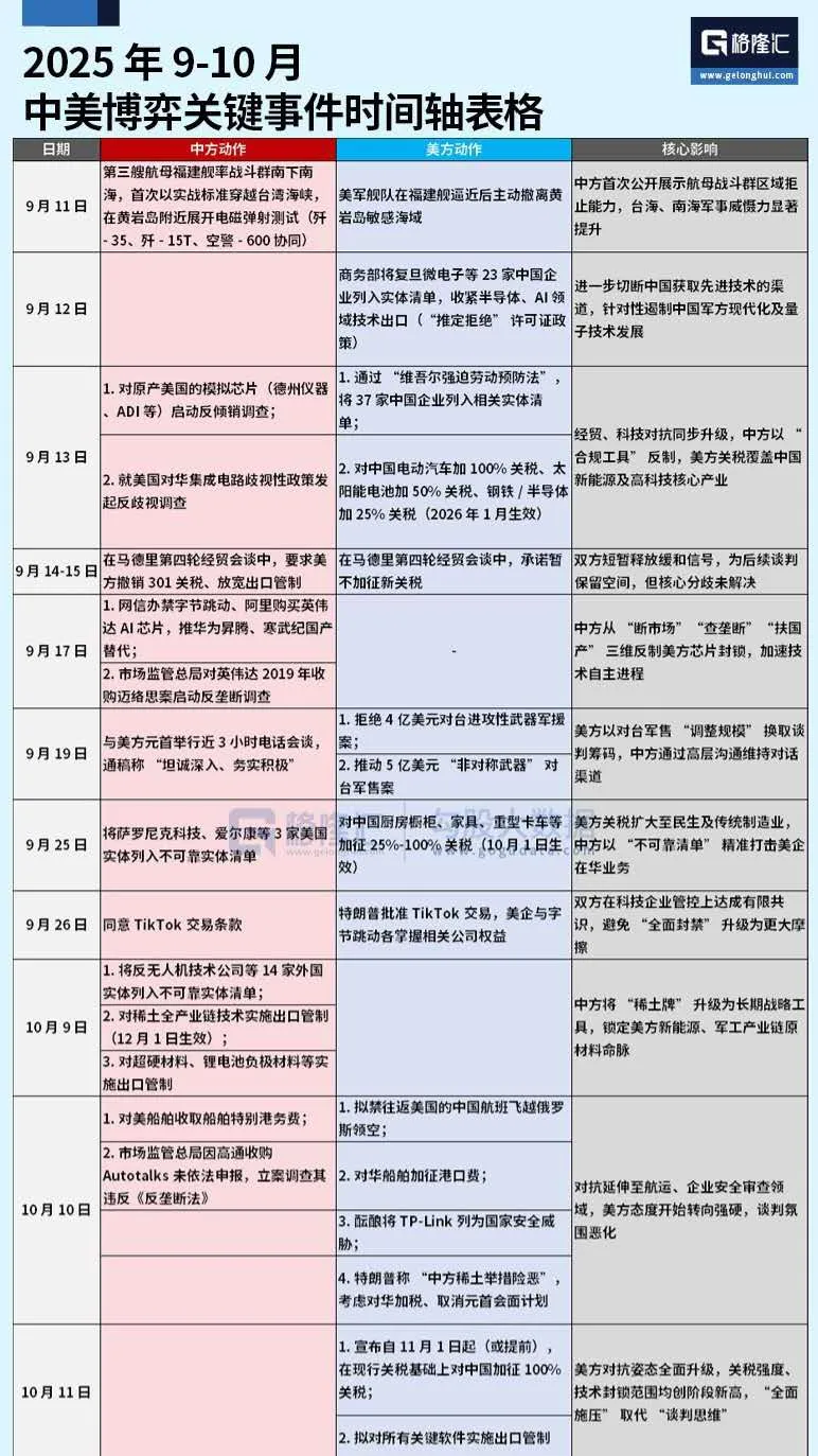 还要注意几个时间节点——中国发布的稀土新规,部分于11月8日生效;川普加征100%关税,定在11月1日。双方这么玩,是为月底会谈中谋取优势的一种手段。
