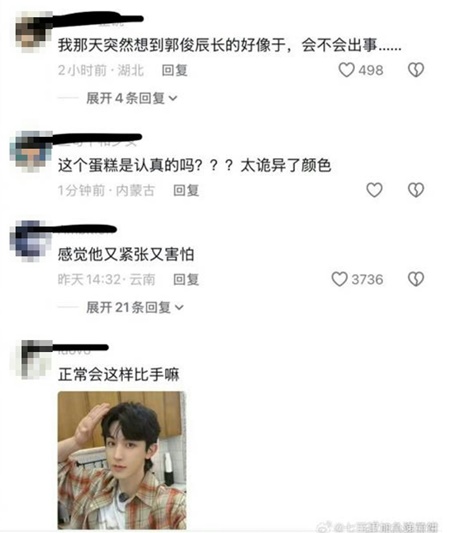 网友纷纷留言,“看了下郭俊辰的直播,真的很诡异。光那个色调就很恐怖,惨白的脸,血红的蛋糕,还哭。”“蛋糕还是冷冻的,切不开。”