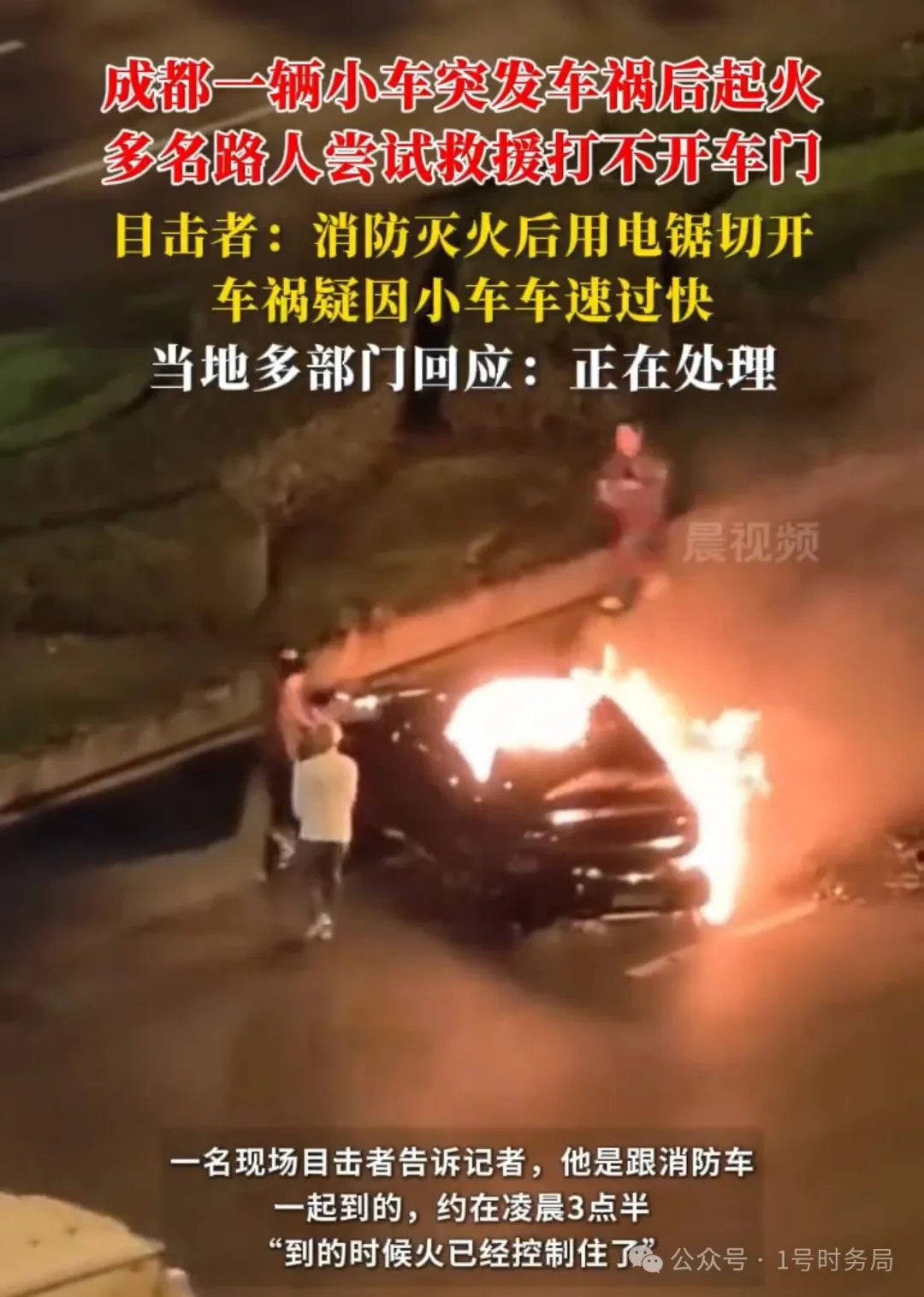 经过:SU7 Ultra超速(目击者估算时速>150km)失控碰撞绿化带,翻滚后爆燃。路人砸窗救援失败,因车门无法开启,消防用电锯破拆后驾驶员已遇难。关键争议:隐藏式门把手断电后完全锁死,违反工信部9月新规草案要求;宣传的“电池向下防爆技术”未阻烈火势。