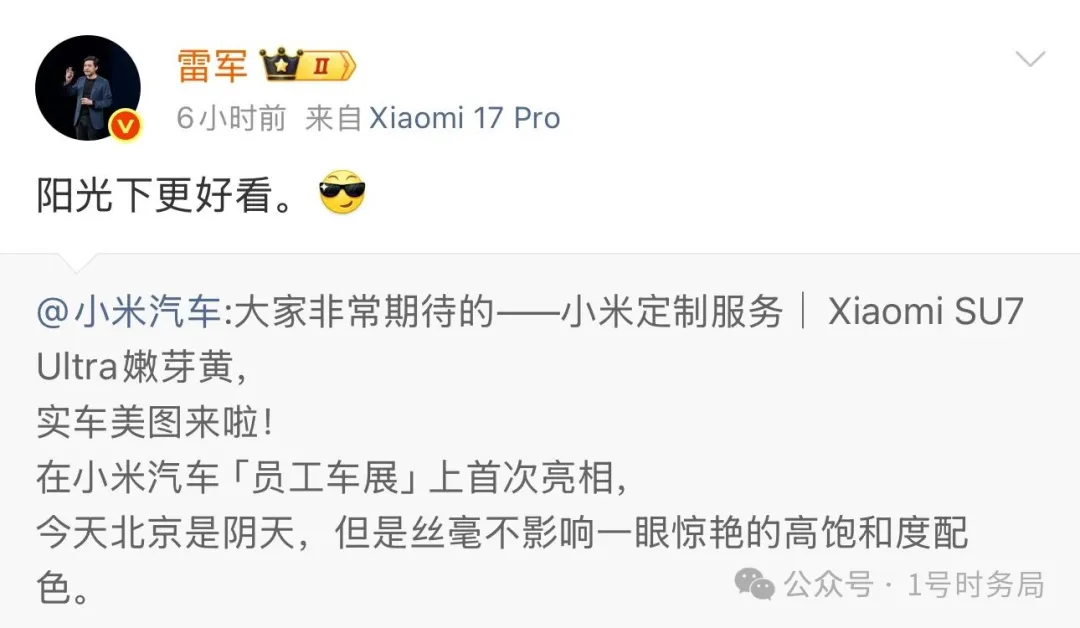 不过,雷军今天转发了两条@小米汽车 发布的宣传博文,其中一条评论是:阳光下更好看。