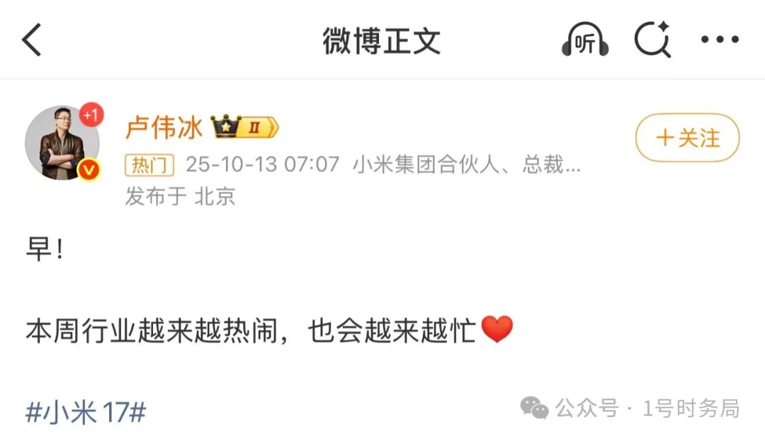 今天早7:07分,小米集团合伙人、总裁卢伟冰也发了一条微博称:本周行业越来越热闹,也会越来越忙。