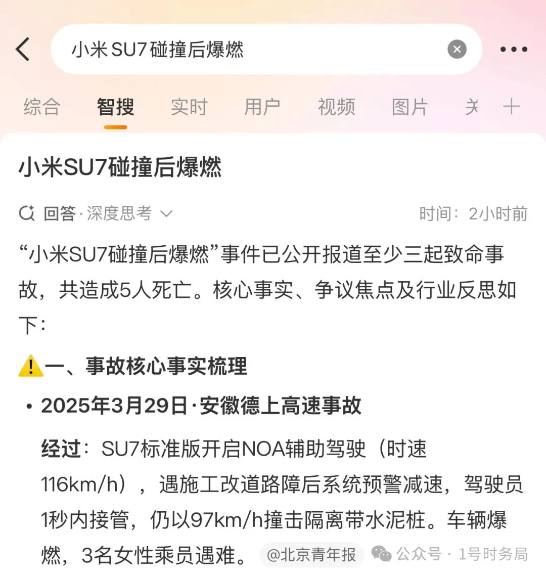 微博智搜提示,“小米SU7碰撞后爆燃”事件已公开报道至少三起致命事故,共造成5人死亡。