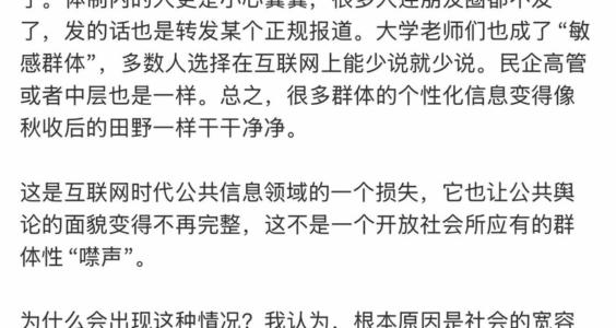无论如何,现在各种有身份标识的群体不愿意在网上发声了,这决非好事。在宪法秩序下推动社会宽松,这方面是一个有抓手也值得去改变的线索之一。我们的社会应当丰富多彩,社交媒体应是全体民众交流信息的平台。如果一些群体退出了,或者严重消极了,只剩下另一些群体在其中活跃表达,那样的情况一定不会太好,会导致新问题的出现。