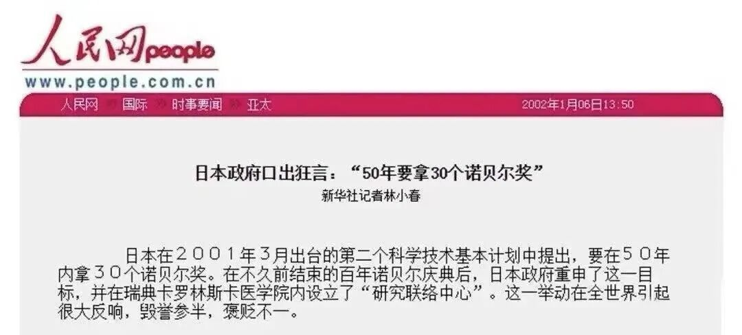 近日,日本科学家坂口志文获得诺贝尔生理学或医学奖,北川进获得诺贝尔化学奖。自21世纪以来,仅仅25年,日本已经诞生了22位诺贝尔自然科学奖得主(其中3位是美籍日本人),算下来“平均每年产生一个”。日本的连夺诺奖也让整个中国舆论场陷入微妙而扭曲的心态,想避谈却又不得,想批判却又无力。部分官媒在报道中甚至开始刻意淡化国籍,在标题中使用诸如“三人获奖、平分奖金”之类的模糊表述。观察者网还发布了一篇名为《“日本人是拿了诺奖,但中国更有钱、更会挖人”》的文章,将“无奖但赢麻”的阿Q精神胜利法体现得淋漓尽致。正因为互联网是有记忆的,所以2002年新华社那篇《日本政府口出狂言:“50年要拿30个诺贝尔奖”》至今受到群嘲。同样的,十年前那篇《中科院院士黄维:十年后,国人获诺奖成家常便饭》也是如此,谁吹牛逼一目了然。