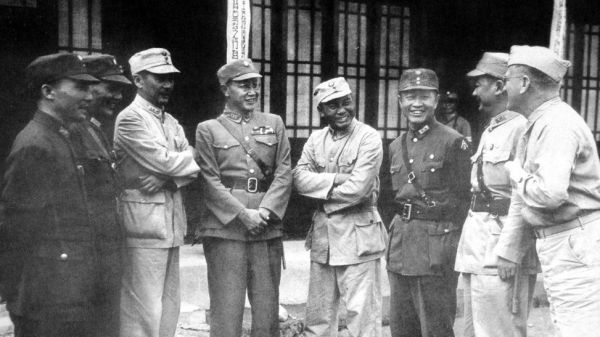(左起)1945年,湘西芷江会战大捷后,王耀武、卢汉、张发奎、会战总指挥何应钦、汤恩伯、杜聿明、萧毅肃在一起交谈。(网络图片)