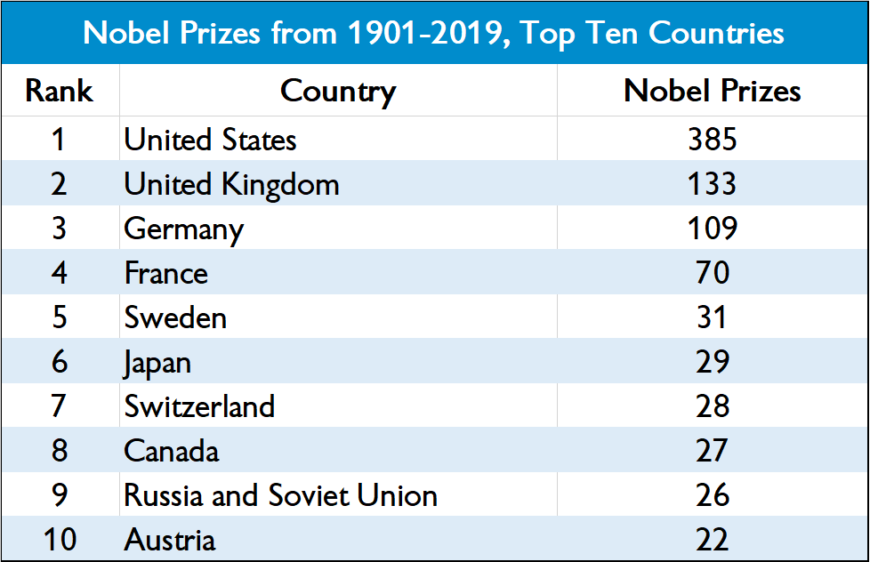 诺贝尔奖是得到广泛认可的授予在科技与人文领域做出杰出贡献者的奖项。尤其是物理学奖、化学奖、生理学或医学奖这三种自然科学领域的诺奖,更受认可和少争议,也反映获奖得主国家和族群的科学能力、教育水准、科技贡献。