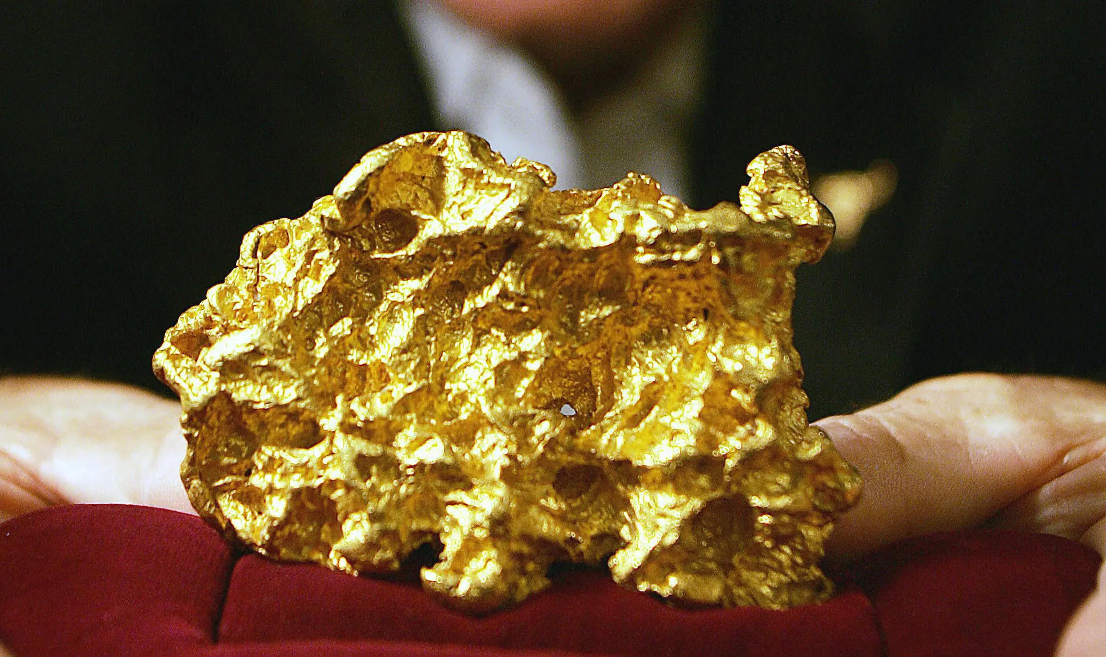 周一(10月13日),美国早盘,黄金和白银价格大幅上涨,金价再创历史新高,白银价格接近1980年创下的历史高点。图为澳洲出土的一块大金块。(Ted Aljibe/Getty Images)