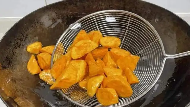 第二步:锅里倒油,油温五成热时下地瓜块。怎么判断油温呢?拿一根筷子插入油中,筷子周围冒出小气泡就差不多了。地瓜要一块一块地下,不能一整盘倒进去,那样会粘在一起的。炸到地瓜表面金黄,用筷子能轻松戳透就可以捞出来了。记得控控油,不然吃起来会腻。