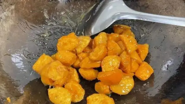 第四步:把炸好的地瓜倒进糖浆里,快速翻炒,让每一块地瓜都均匀地裹上糖浆。这时候动作要快,不然糖浆容易凝固。
