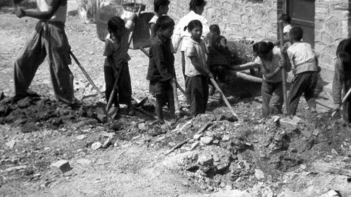 有很长一段时间,每个班级都要轮流挖洞(防空洞)把学校地下都掏空了。这可是重体力活,记得我们的工作是运土,两个学生一根扁担把一个大筐放在中间挑土,我瘦小单薄的肩膀都压肿了,但慢慢适应后就一点都不痛了。