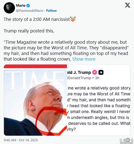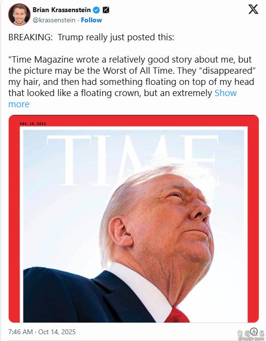 《时代》这期的封面报道把加萨停火协议描述为“可能成为川普第二任期的重大成就”,获得川普正面评价,但杂志门面用的特写照片让他的头发看起来不够蓬松茂密,显然犯了川普的大忌。