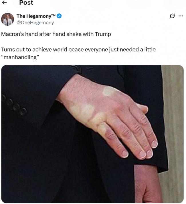 2024年12月,巴黎圣母院重新开放,川普亲访,当时与马克龙紧紧握手10秒还彼此拥抱,英国名嘴摩根(Piers Morgan)调侃“川普与马克龙比腕力真令我怀念”。今年2月,马克龙赴白宫拜访川普,当时川普手部乌青引起热议,白宫坚称“频繁握手”所致,网友笑称“看来他跟马克龙又握手较劲了一回”。