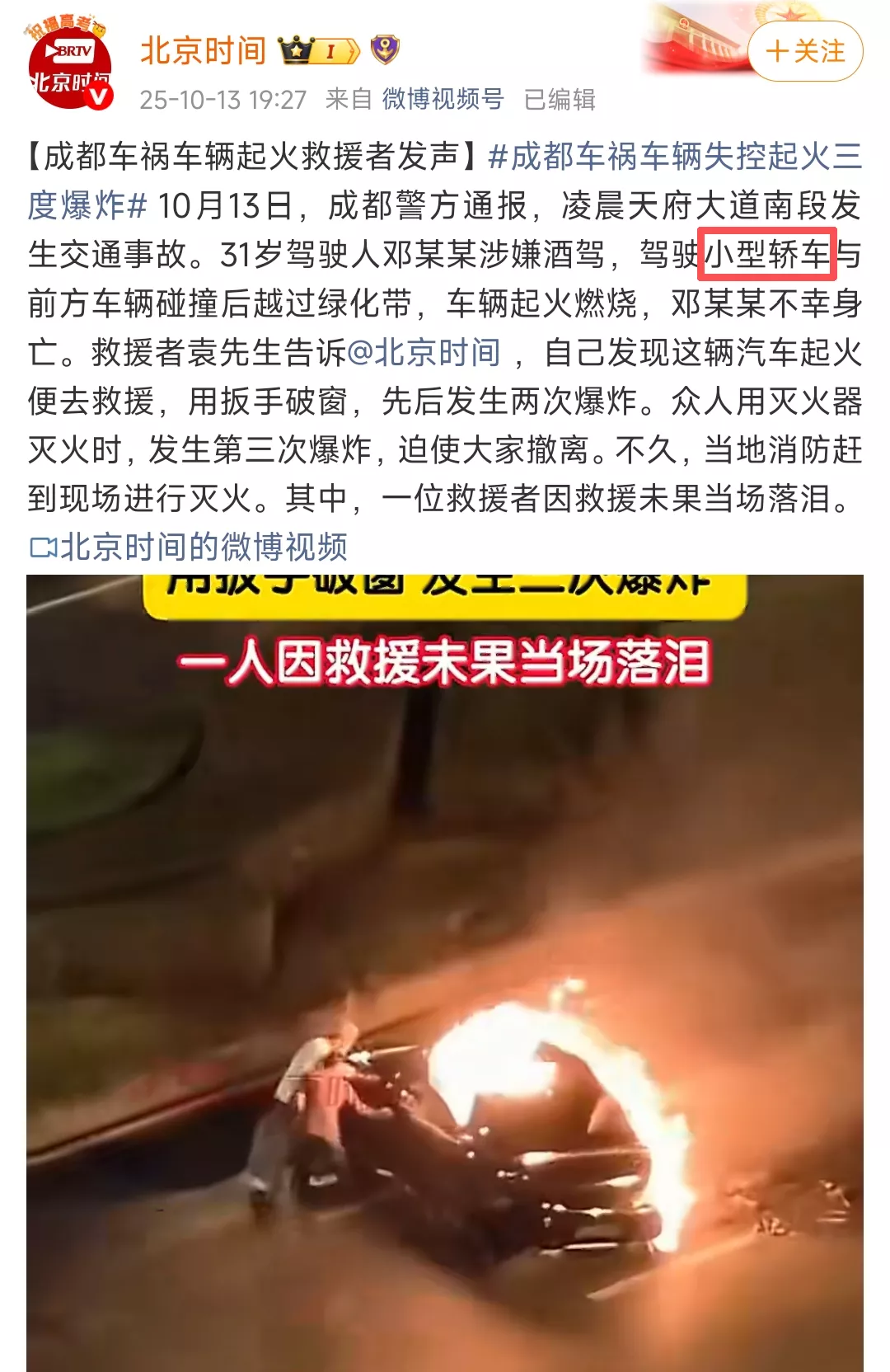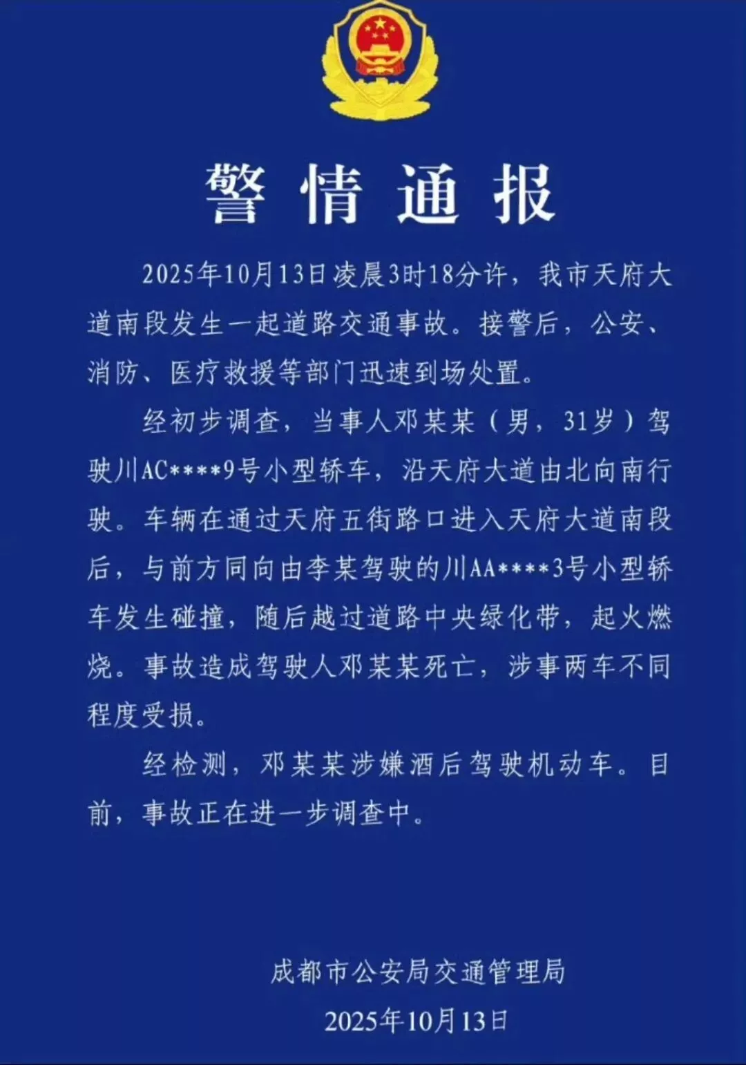 就比如,据官方警情通报可知,事件发生在2025年10月13日凌晨3时18分左右,地点是成都市天府大道南段,驾驶员邓某某(31岁)涉嫌酒驾,追尾前车后,撞击绿化带翻滚起火身亡。