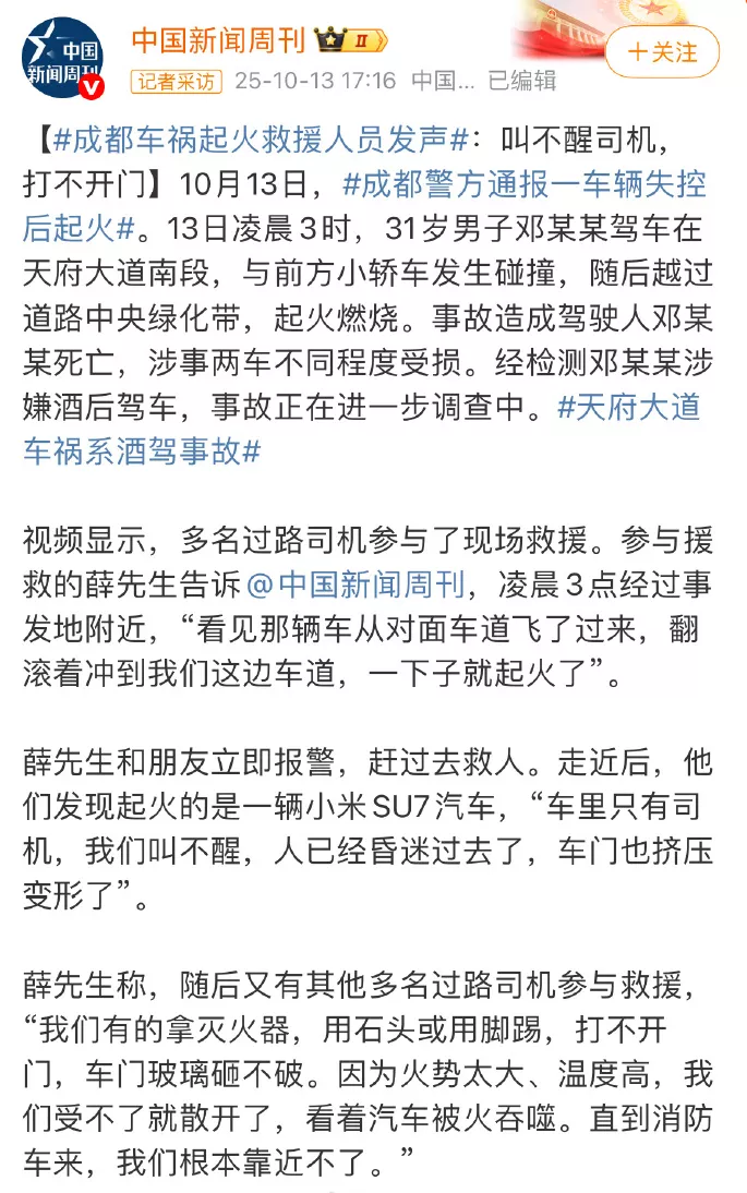 虽然通报没说出车祸的是什么车,但权威媒体《中国新闻周刊》其实已经报道,起火的车辆就是小米SU7。