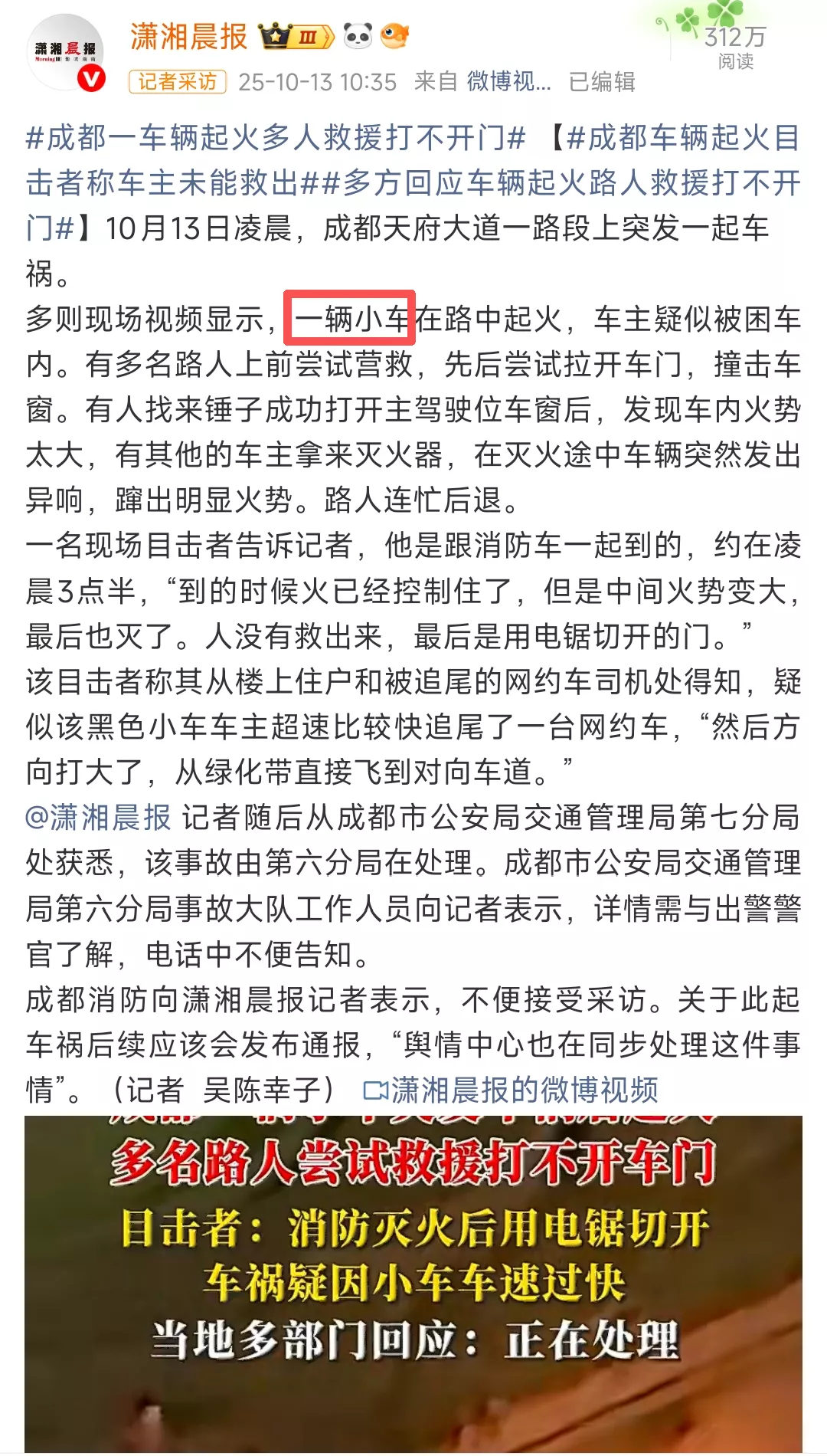 而据《三湘都市报》报道,消防人员到场后,先用水枪压制火势,随后用工具切割车身救援,现场方才逐步得到控制,但驾驶员已不幸遇难。