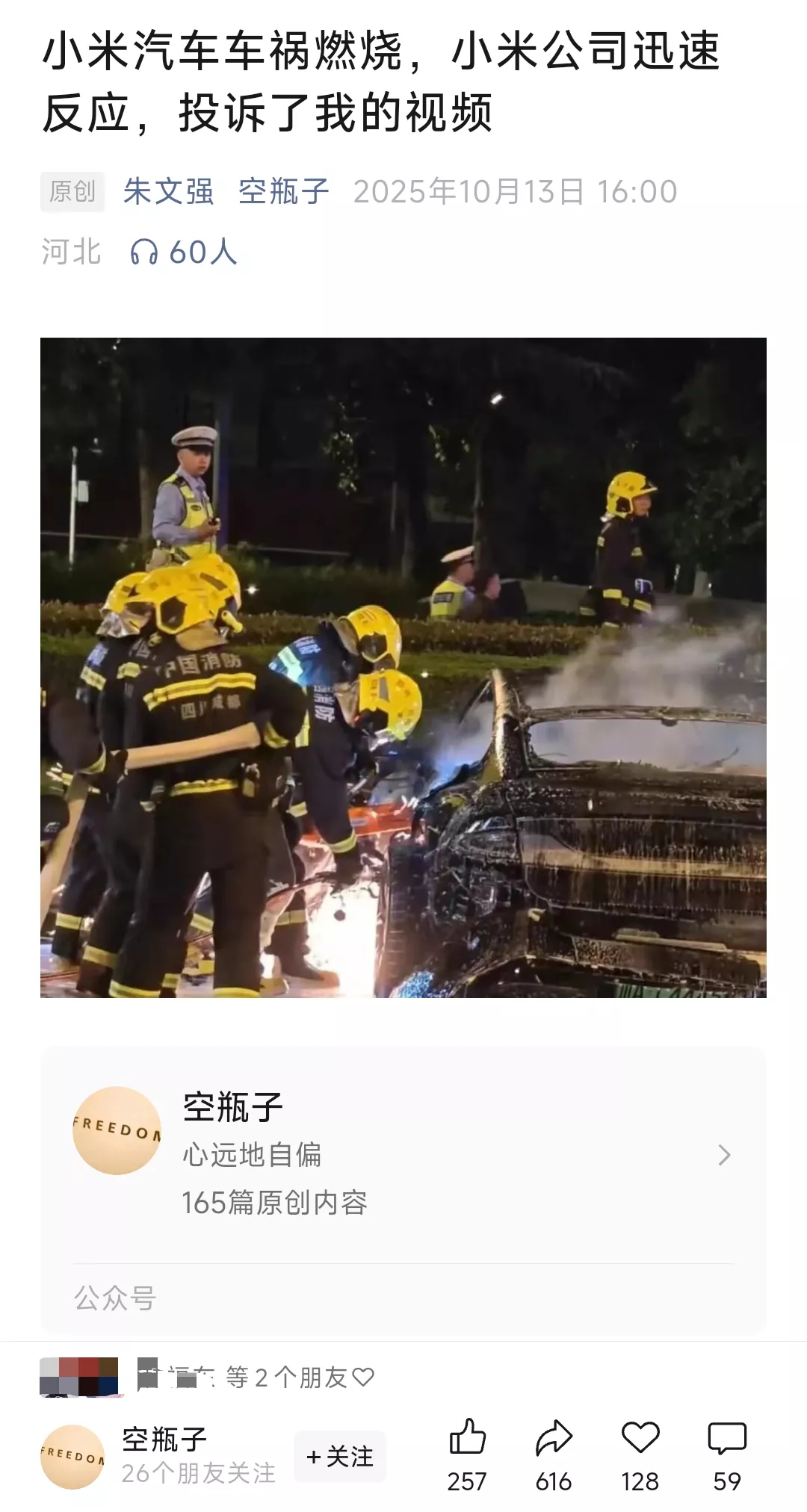 早上我又看到,博主“朱文强”发了关于成都小米汽车车祸燃烧的视频,也被小米迅速投诉了。
