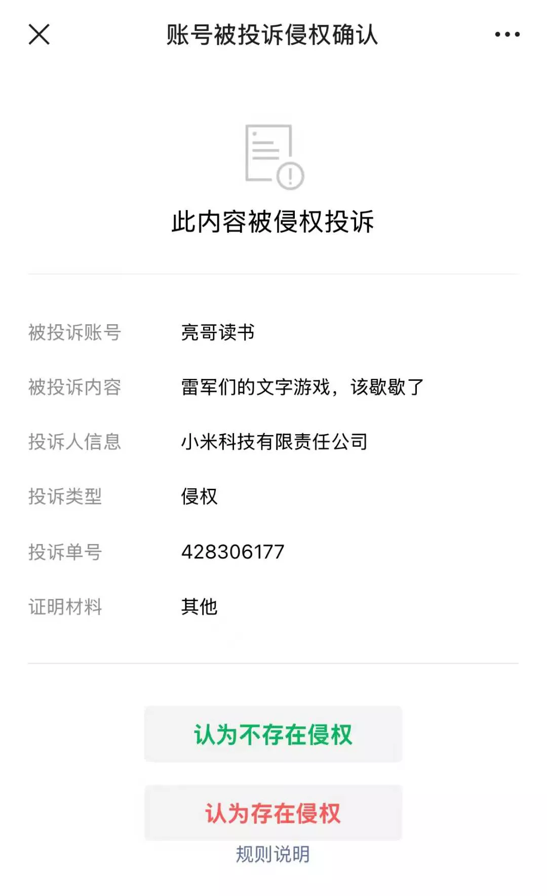 我之前在“亮哥读书”号上写的《雷军们的文字游戏,该歇歇了》,已经被“小米科技有限责任公司”投诉并删除了。