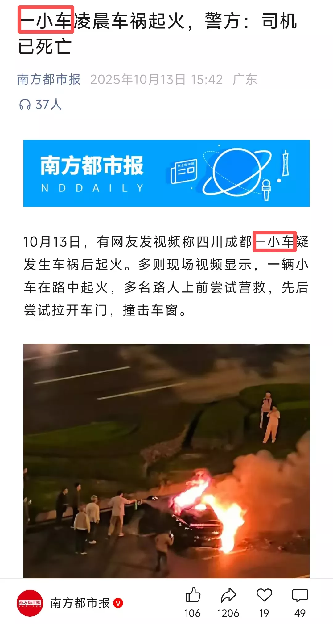 在这起事故的报道中,出现了一个诡异的现象: 虽然现场照片及多源信息都已经确认,起火的车子就是小米SU7,甚至都已经精确到是SU7Ultra,但很多媒体在报道时,竟然不约而同地回避了涉事汽车的品牌。 “小型轿车”、“一辆小车”、“一小车”,代替了汽车品牌,堂而皇之地出现在了新闻里。
