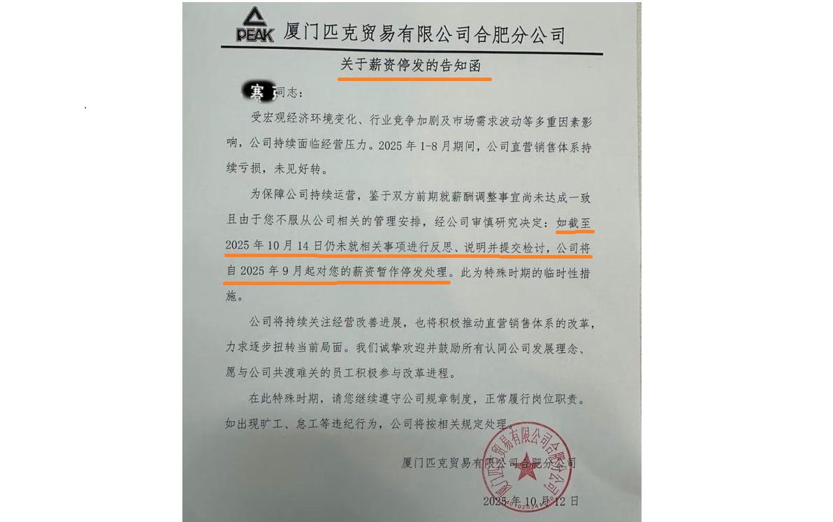 据大陆“上游新闻”报导,匹克员工近日提供了一份匹克公司下发给员工的《关于薪资停发的告知函》。这份加盖红章的正式文件说,“如您至2025年10月14日仍未就相关事项进行反思、说明并提交检讨,公司将自2025年9月起对您的薪资暂作停发处理。”