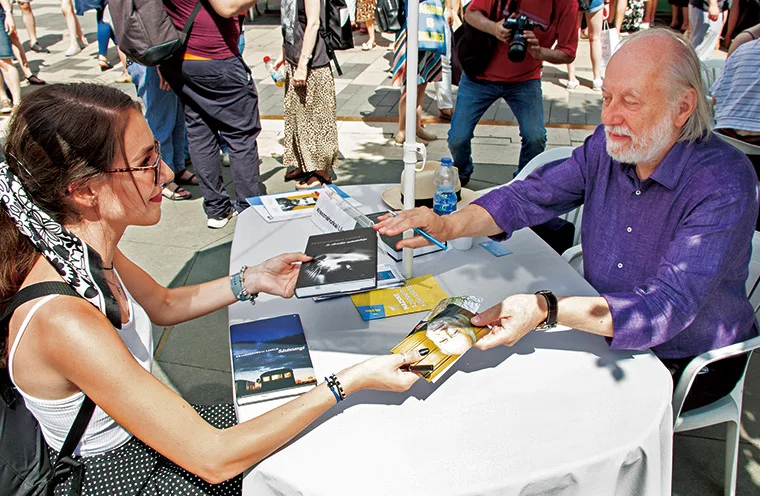 ▲卡撒兹纳霍凯(右)在欧洲已是备受推崇的知名作家,见面会上吸引许多书迷排队签名。(图/法新社)