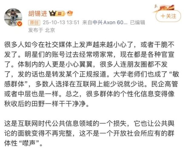 阿波罗网王笃若报道/前《环球时报》总编胡锡进10月13日在微博发文,罕见吐槽大陆网络环境,称“很多人发声越来越小心,或者干脆不发”,形容网络空间已成“群体性噤声”。他点名明星、体制内人士、大学教师、民企高管都在自我噤声,朋友圈像“秋收后的田野一样干净”。