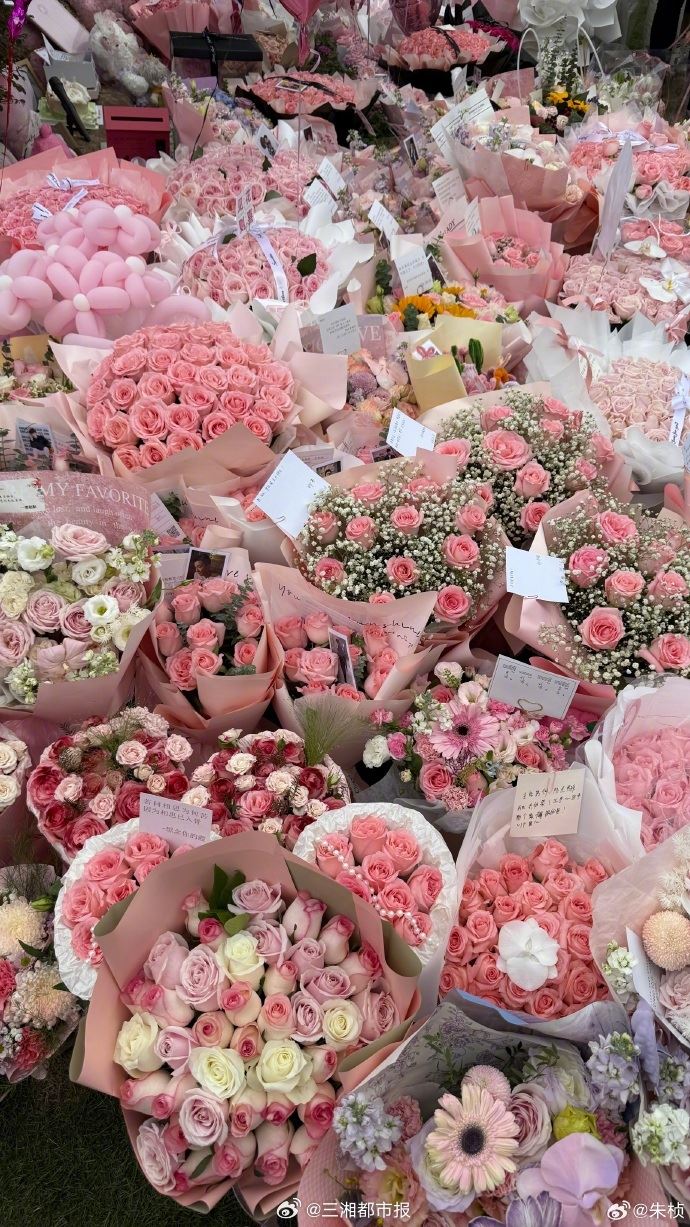 粉丝在墓园摆满粉色鲜花与气球,这也是乔任梁生前最爱的颜色。(图/翻摄自微博)