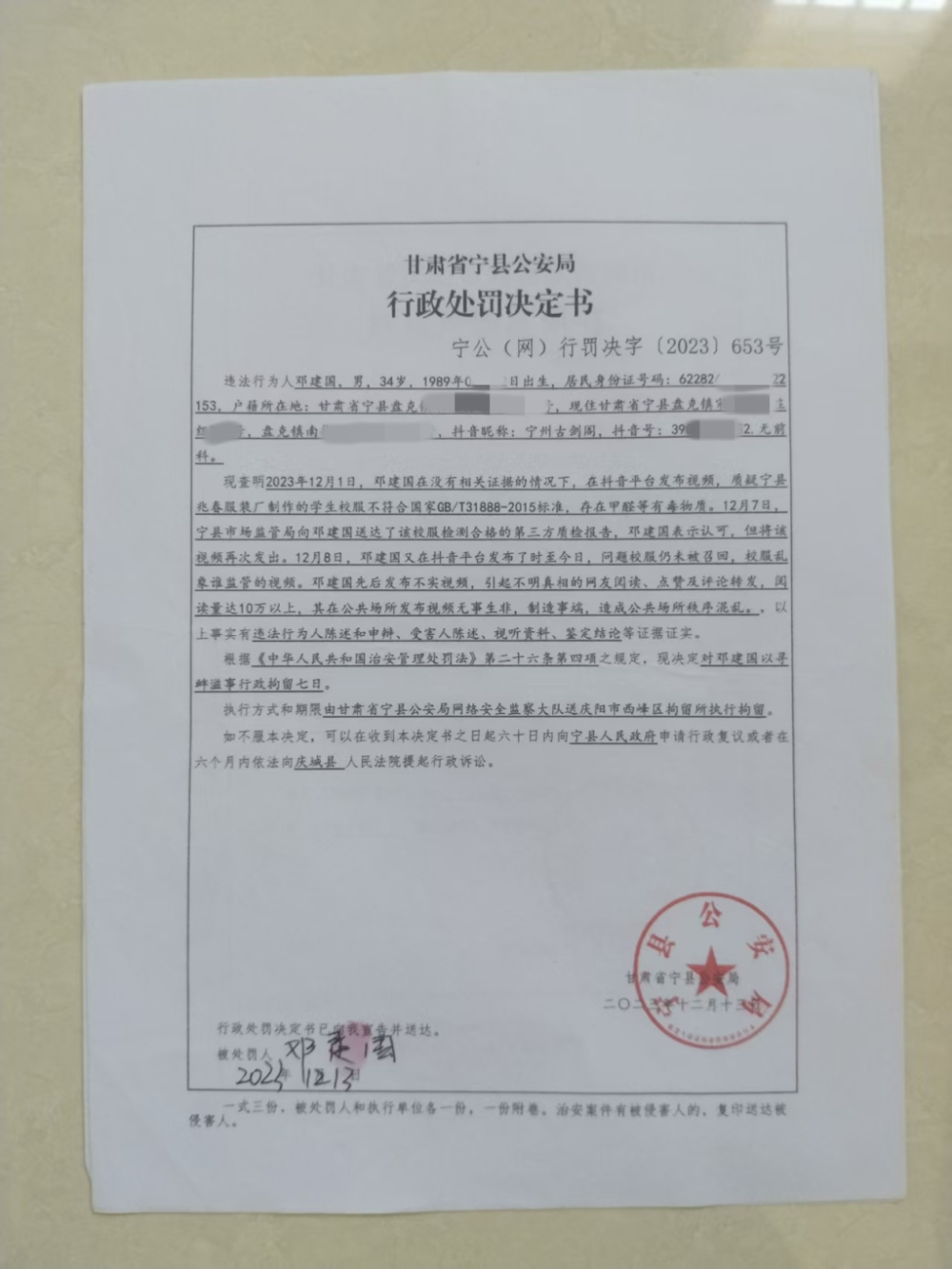 据澎湃新闻报道,2023年12月,因在网上发视频反映儿子学校校服存在质量问题(质疑标注成分与质地不符、有甲醛等有毒物质等),甘肃庆阳市宁县36岁男子邓建国在校服厂商报案后,被宁县公安局网络安全监察大队以寻衅滋事行政拘留七天。