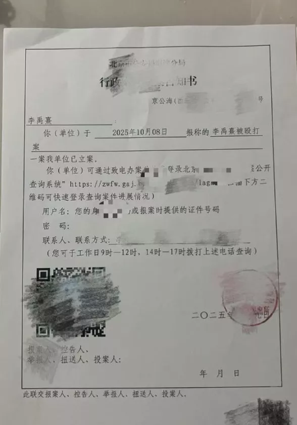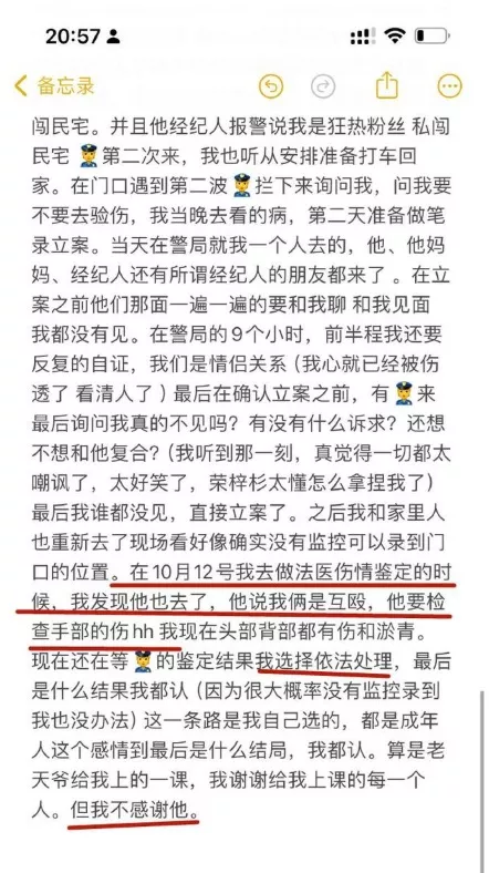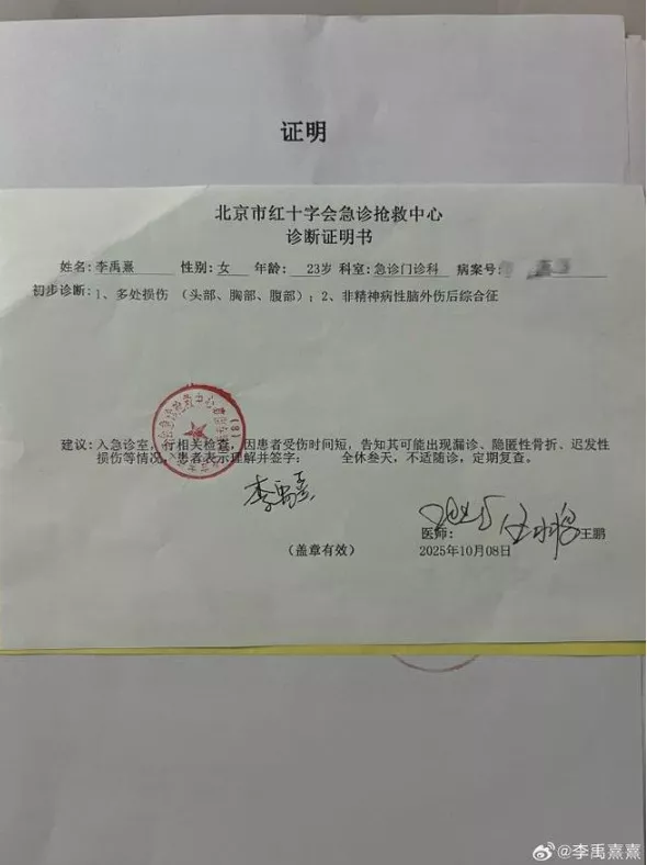为了证明自己所言非假,在发布长文之后,李禹熹又发布了一条动态,她晒出了她在医院的诊断证明,和警局的立案告知书。