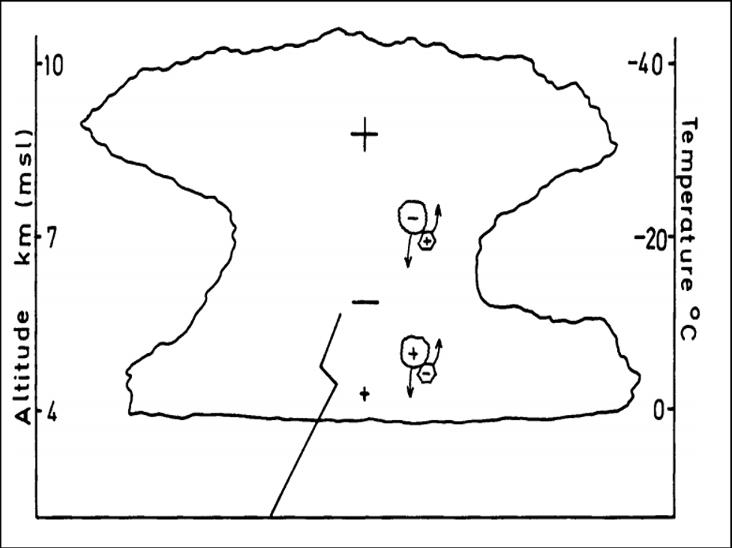 在云层高海拔区域的低温下,冰的挠曲电系数决定了大小冰球相撞时,冰粒更易带正电,而霰粒易带负电。随着冰粒随风向上运动,雷暴云上层便积累了大量正电荷。而霰粒会一直向下坠落,这就导致雷暴云的中下层主要带负电。然而,在靠近地表、温度相对较高的云层区域,冰的挠曲电系数符号突然翻转,这就导致在该区域碰撞时,霰粒反而易带正电,于是形成了雷暴云底部的一小片正电荷区域。