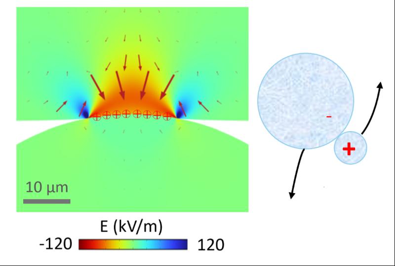 霰粒,又称软雹,可以视为质地较软的大冰球,与之相对的冰粒则是坚硬的小冰球。自然界中的水都掺有杂质,因此云中大大小小的冰球表面的薄液体层并非纯水,而是富含正负离子。当上升气流推着小冰球向上移动时,往往会与因重力向下运动的大冰球频繁相撞。高速撞击时,大小冰球接触的界面会出现非常不均匀的形变,此时产生的挠曲电场,便会驱动冰球表面薄液体层中的正负离子,分别移动到霰粒和冰粒上。