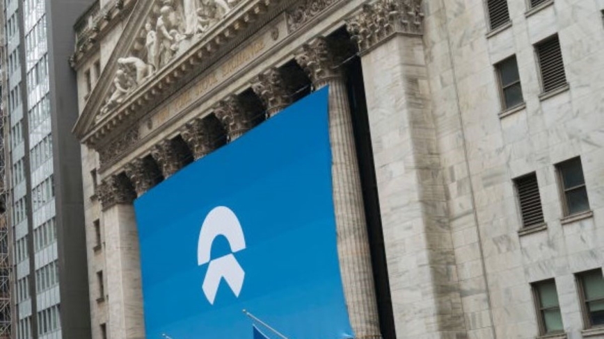 资料图。纽约证券交易所(NYSE)的大楼外墙上展示的中国电动车制造商蔚来汽车的标志。(Drew Angerer/Getty Images)