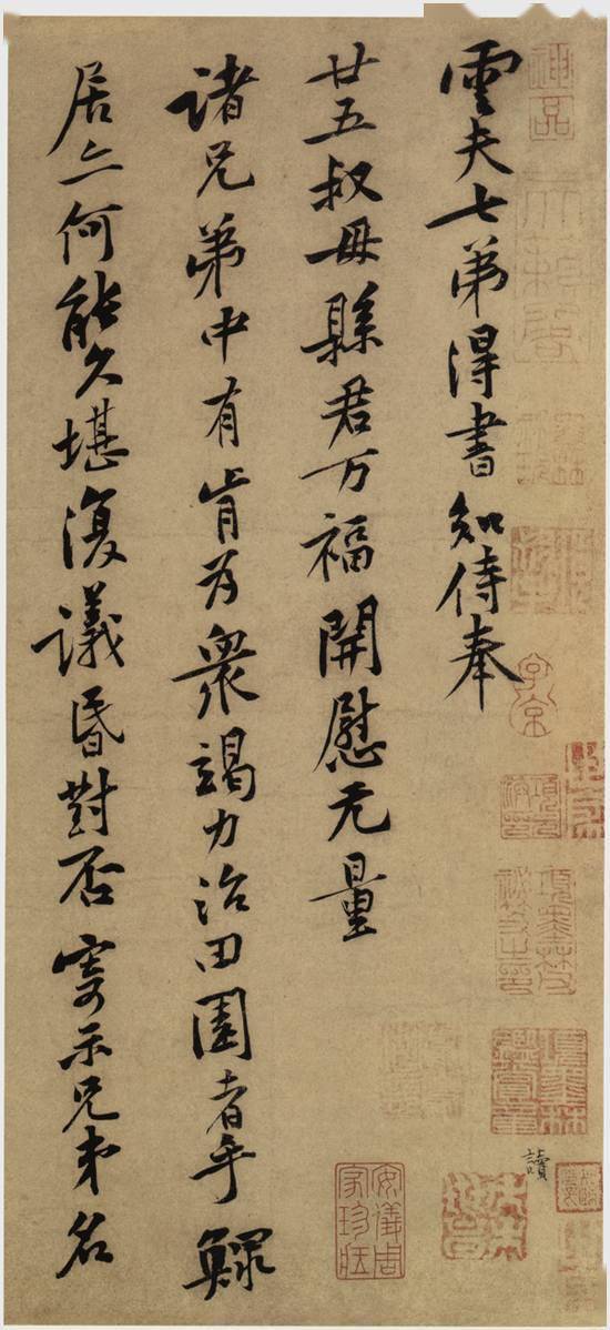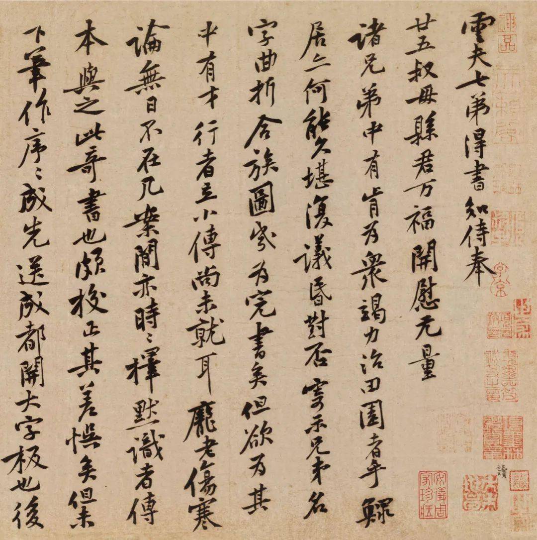 释文:云夫七弟:得书,知侍奉廿五叔母县君万福,开慰无量。诸兄弟中有肯为众竭力治田园者乎?鳏居亦何能久堪,复议昏对否?寄示兄弟名字曲折,合族固,几为完书矣c但欲为其中有才行者立小传,尚未就耳。庞老《伤寒论》无日不在油案间,亦时时择默识者传本与之。此奇书也,颇校正其差误矣,但末下笔作序。序成,先迭成都开大字板也,谈信可寄矣。蕲州州藏记亦不忘,但老来极懒,故稽缓如此耳。寿安姑、东卿一月中俱不起,闻之悲塞。二子虽有水皑为生资,子顾弟乔能周旋之乎?窀穸之事,计子顾必能尽力矣。叔母不甚觉老否?徐氏妹孀居,如何调护令不爽邪?无期相见,千万为亲自爱。十月十日,兄庭坚报云夫七弟。