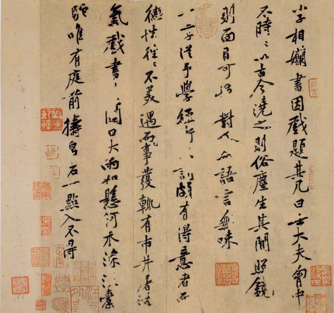 黄庭坚在上溯晋唐、学习前人经典书法时,对其影响最大的莫过于苏轼,可以说黄庭坚的手札小行书在很大程度上是学苏轼的。黄庭坚作为“苏门四学士”之一,不能不受苏轼书风的影响。在黄庭坚书论中,评东坡书颇多,且多为推崇备至者。苏东坡不仅是黄庭坚文学上的老师和提携者,而且也是其书法的学榜样。