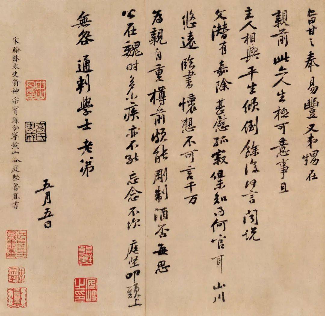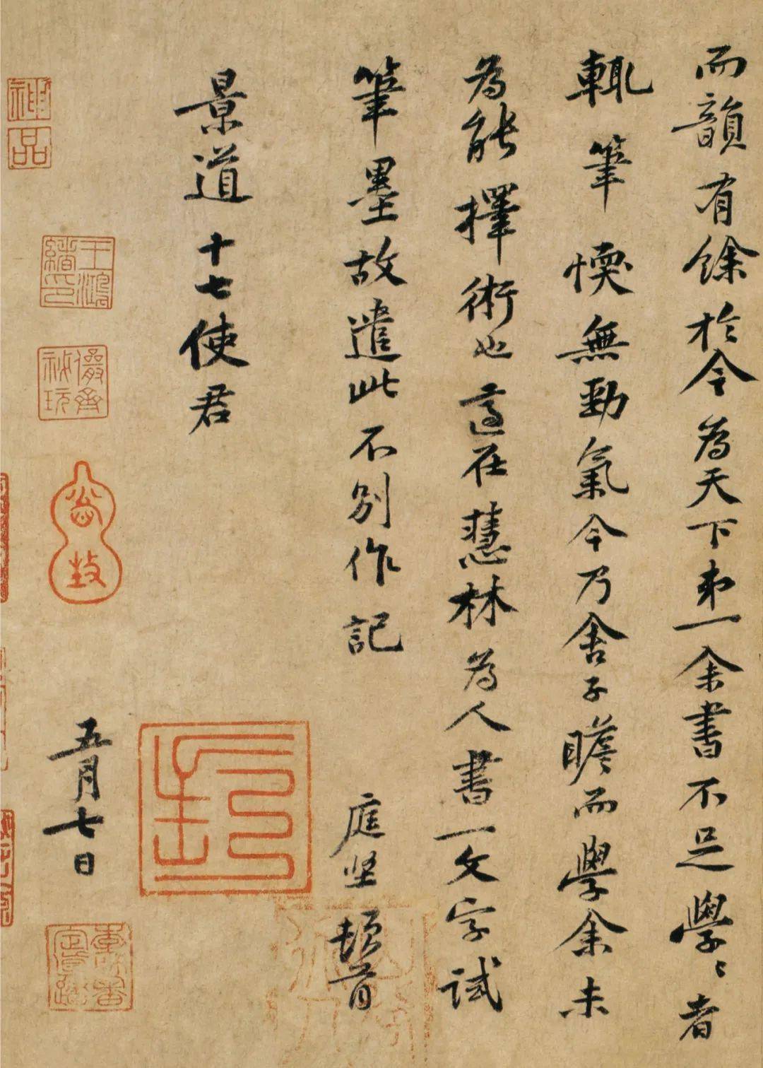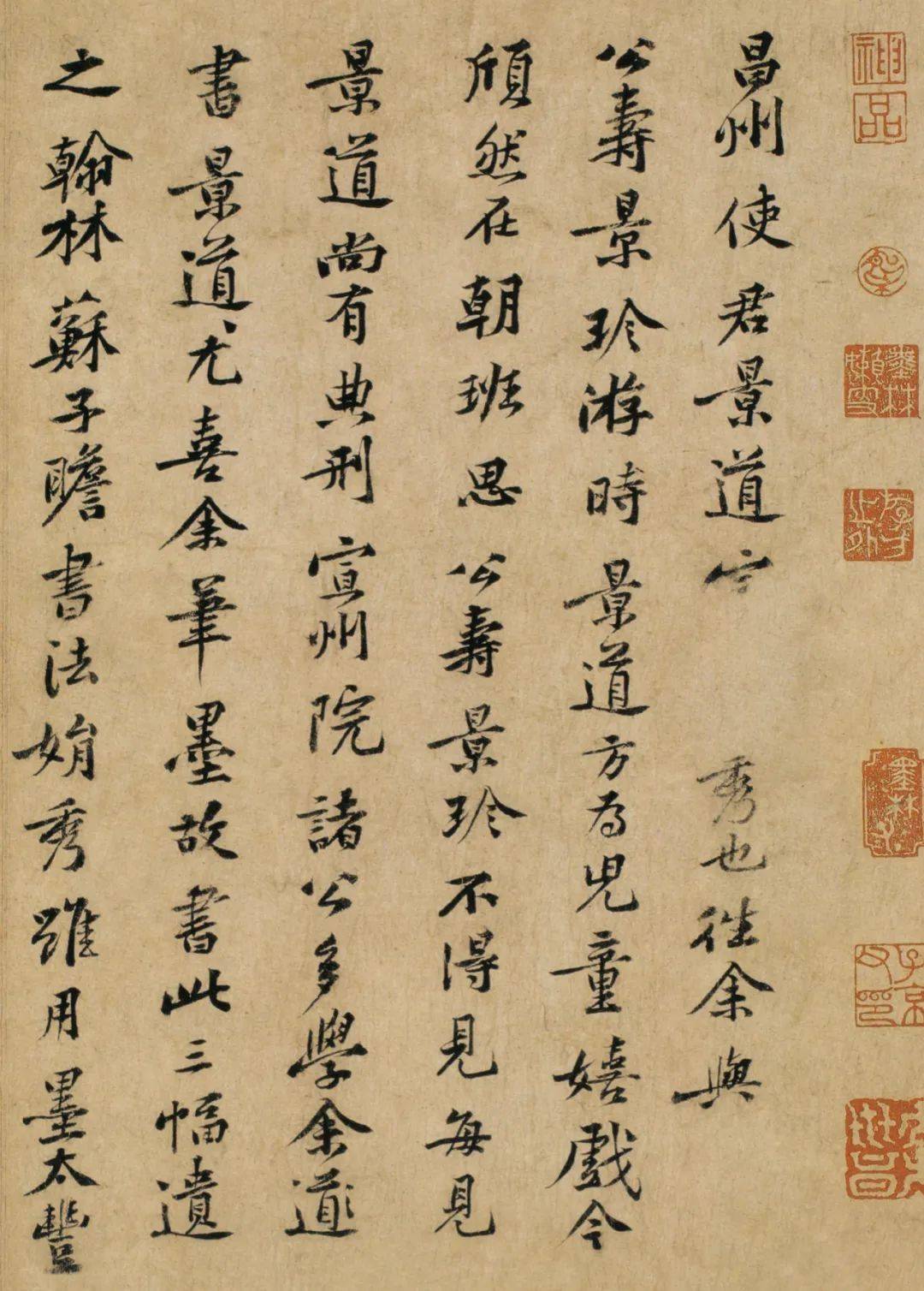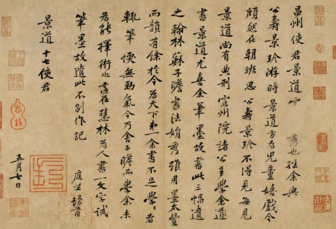 释文:昌州使君景道。宗……秀也。往余与公寿景珍游。时景道方为儿童嬉戏。今颀然在朝班。思公寿景珍不得见。每见景道。尚有典刑。宣州院诸公。多学余。道。书。景道尤喜余笔墨。故书此三幅遗之。翰林苏子瞻。书法娟秀。虽用墨太丰。而韵有余。于今为天下第一。余书不足学。学者辄笔愞无劲气。今乃舍子瞻而学余。未为能择术也。适在慧林。为人书一文字。试笔墨。故遣此。不别作记。庭坚顿首。景道十七使君。五月七日。