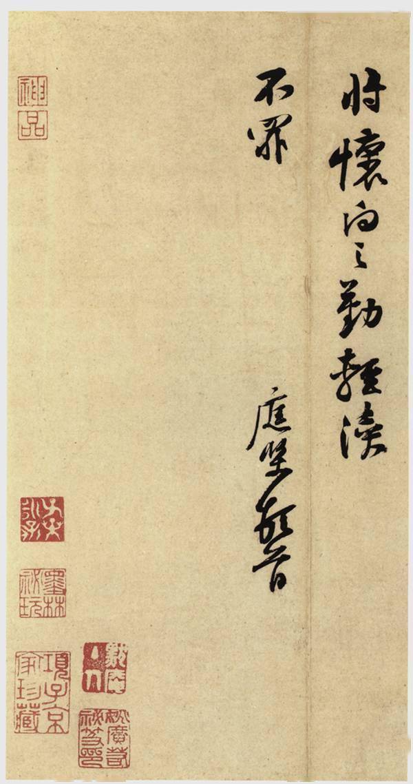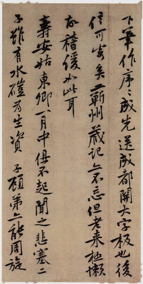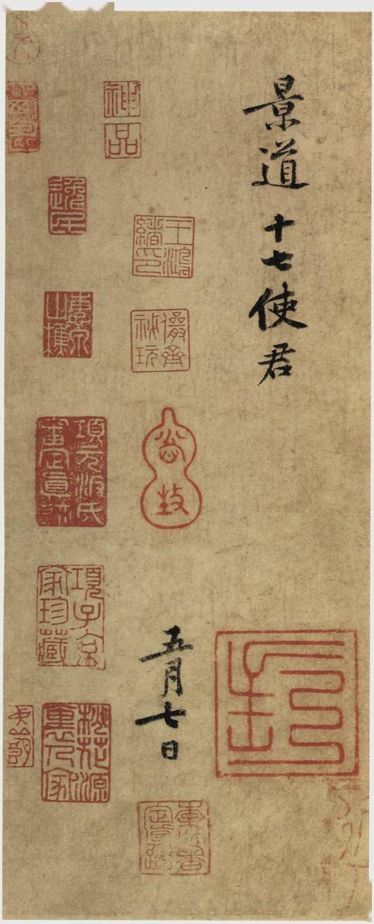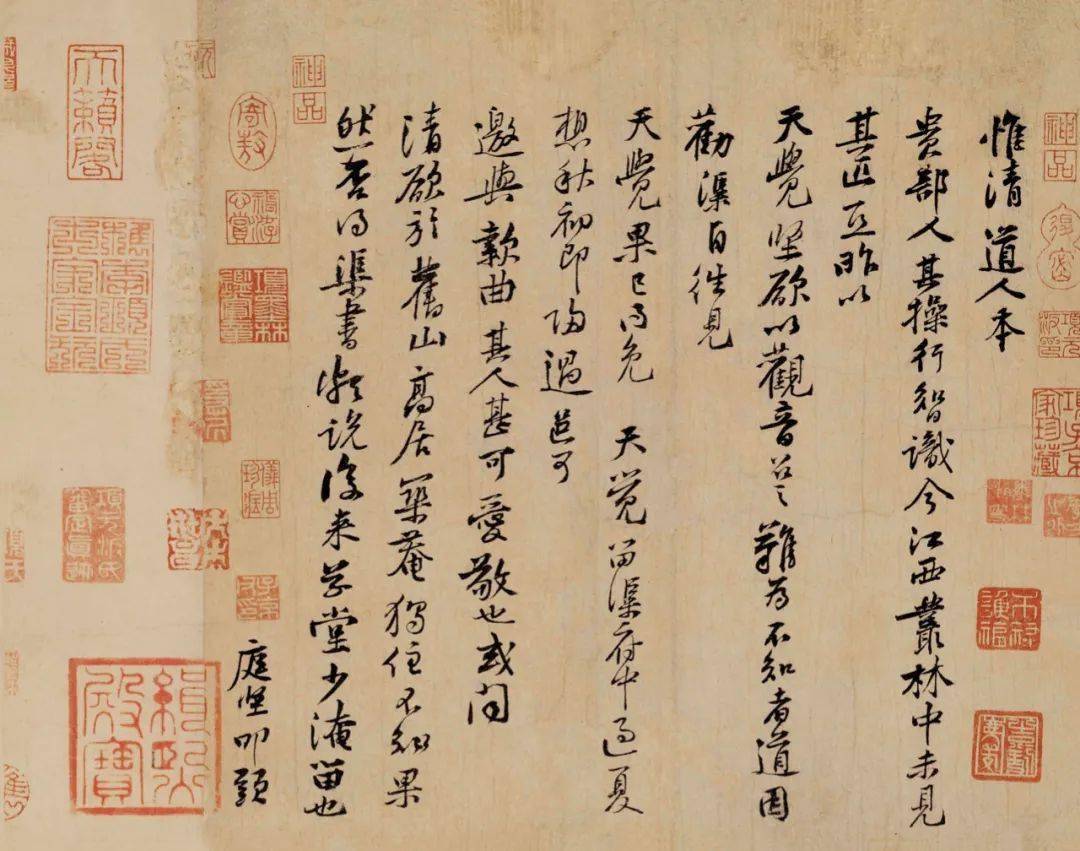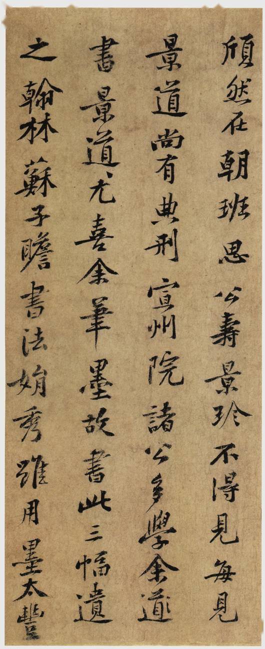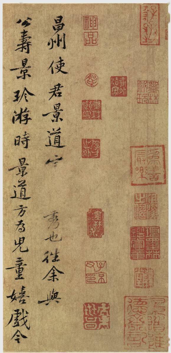 释文:昌州使君景道。宗……秀也。往余与公寿景珍游。时景道方为儿童嬉戏。今颀然在朝班。思公寿景珍不得见。每见景道。尚有典刑。宣州院诸公。多学余。道。书。景道尤喜余笔墨。故书此三幅遗之。翰林苏子瞻。书法娟秀。虽用墨太丰。而韵有余。于今为天下第一。余书不足学。学者辄笔愞无劲气。今乃舍子瞻而学余。未为能择术也。适在慧林。为人书一文字。试笔墨。故遣此。不别作记。庭坚顿首。景道十七使君。五月七日。