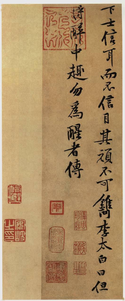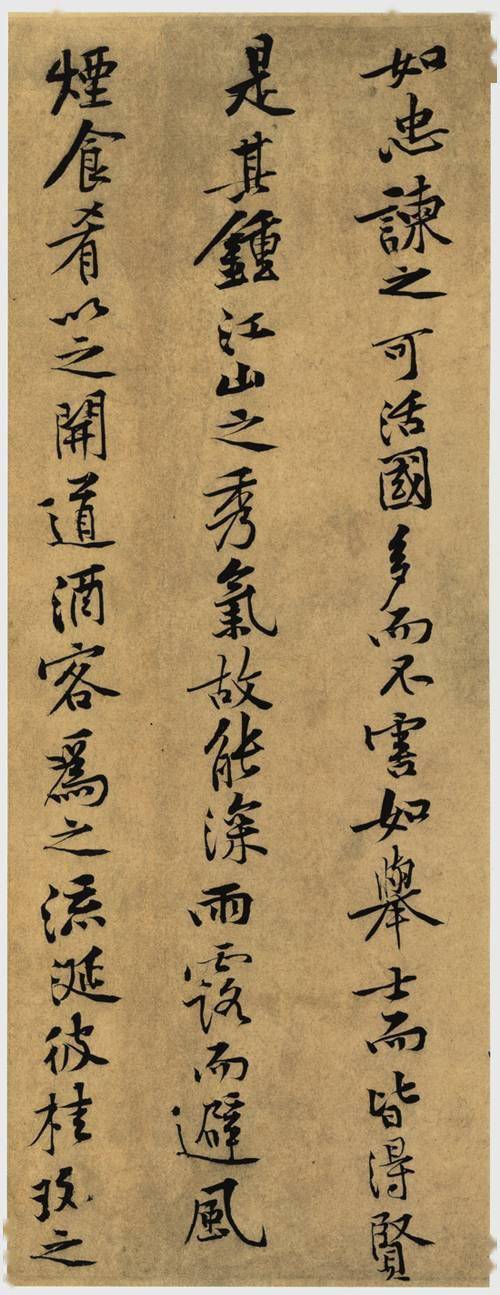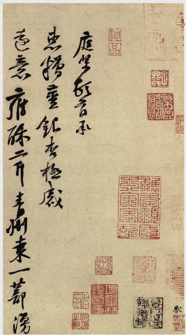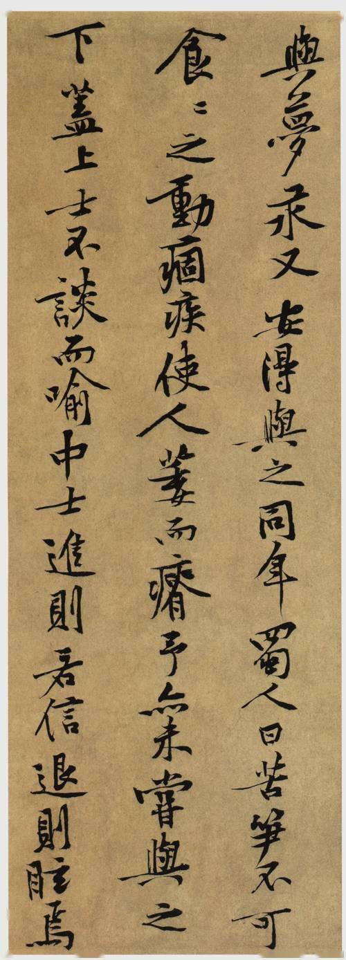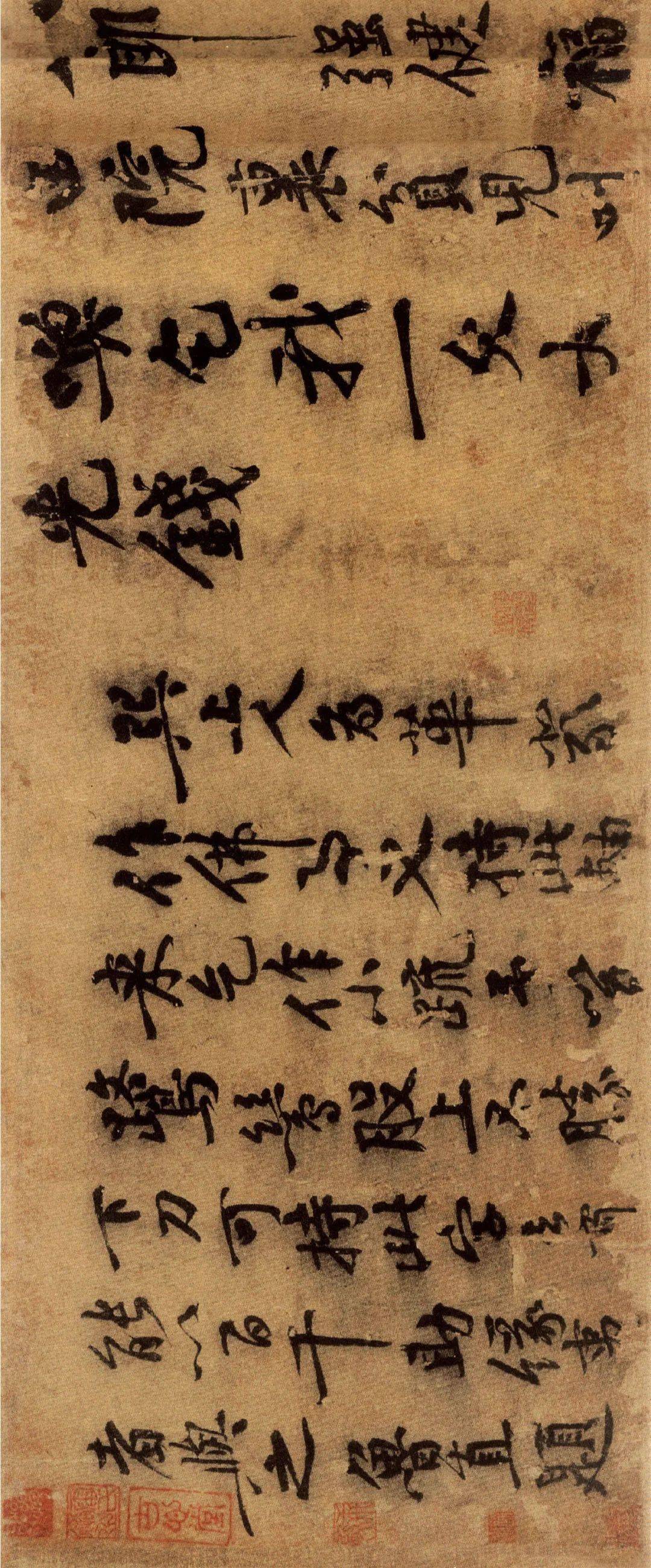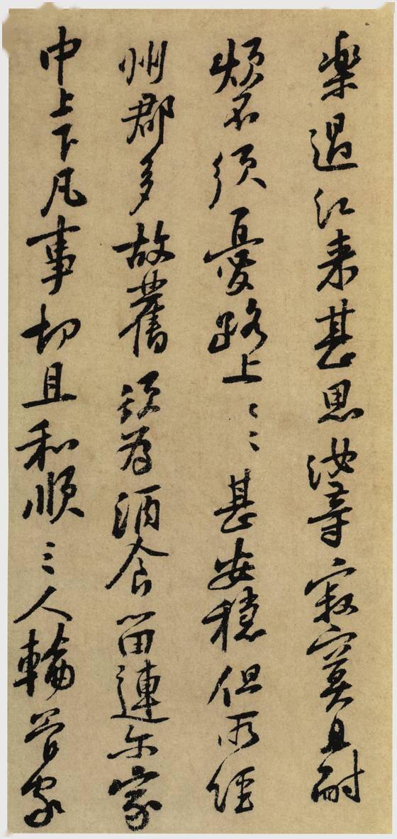 释文:昌州使君景道。宗……秀也。往余与公寿景珍游。时景道方为儿童嬉戏。今颀然在朝班。思公寿景珍不得见。每见景道。尚有典刑。宣州院诸公。多学余。道。书。景道尤喜余笔墨。故书此三幅遗之。翰林苏子瞻。书法娟秀。虽用墨太丰。而韵有余。于今为天下第一。余书不足学。学者辄笔愞无劲气。今乃舍子瞻而学余。未为能择术也。适在慧林。为人书一文字。试笔墨。故遣此。不别作记。庭坚顿首。景道十七使君。五月七日。
