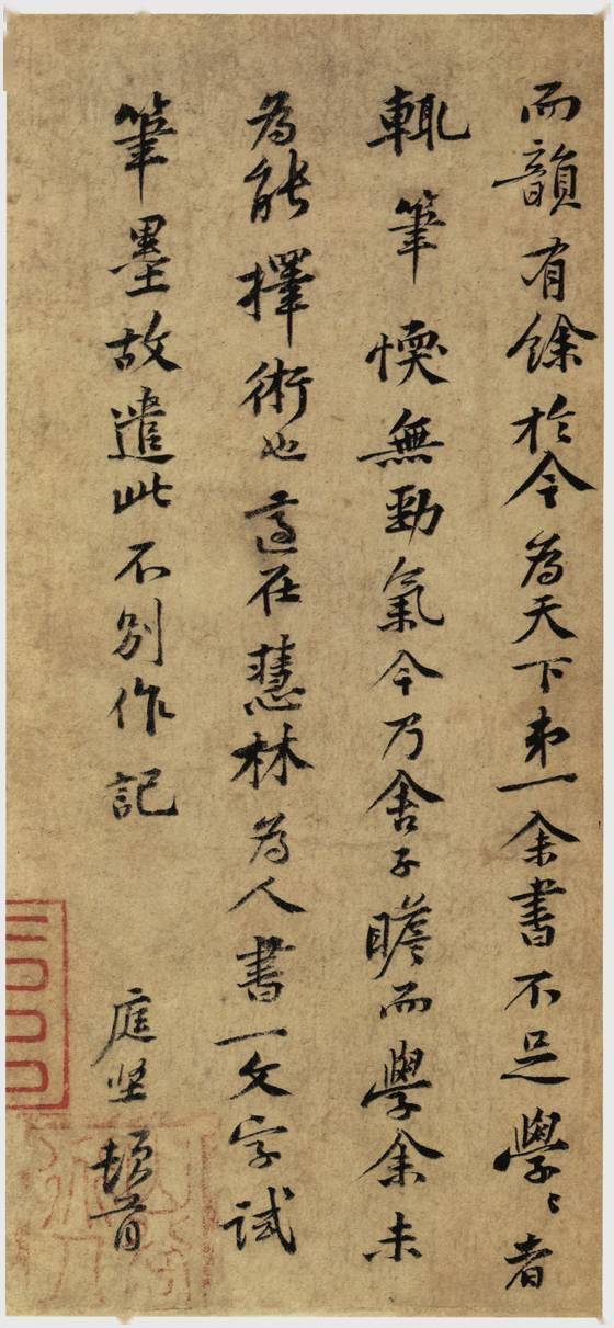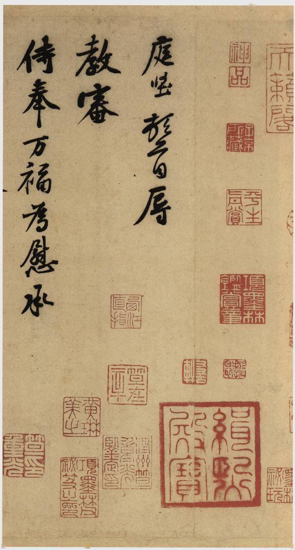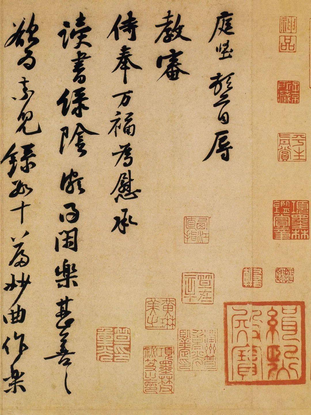 释文:庭坚顿首,辱教审侍奉万福为慰。承读书绿阴,颇得闲乐,甚善甚善。欲为索儿录数十篇妙曲作乐,尚未就尔。所送纸太高,但可书大字,若欲小行书,须得矮纸乃佳。适有宾客,奉答草率。庭坚顿首。立之承奉足下。